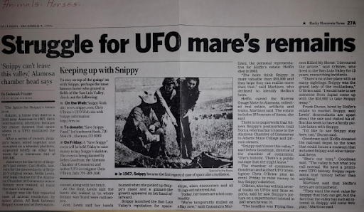 - UFO legend: horse found dead and mutilated 55 years ago in Colorado gets new life at roadside attraction. (online article).